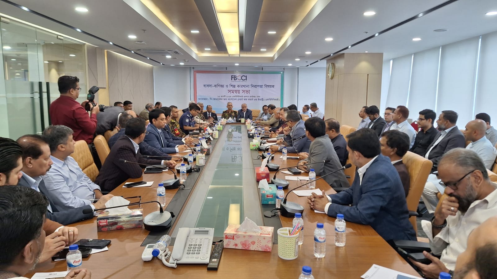 এফবিসিসিআই আয়োজিত ব্যবসা-বাণিজ্য ও শিল্প কারখানা নিরাপত্তা বিষয়ক সমন্বয় সভা ১৩ আগষ্ট ২০২৪, সকাল ১১.৩০টায় এফবিসিসিআই গুলশান অফিস, আকাশ টাওয়ার, বাড়ি-৫৪, রোড-১৩২, লেভেল-৯, গুলশান-১ এ অনুষ্ঠিত হয়। সভায় সভাপতিত্ব করেন এফবিসিসিআই সভাপতি জনাব মাহবুবুল আলম। সভায় উপস্থিত ছিলেন বাংলাদেশ সেনাবাহিনীর নবম পদাতিক ডিভিশনের জেনারেল অফিসার কমান্ডিং (জিওসি) ও এরিয়া কমান্ডার (সাভার) মেজর জেনারেল মোঃ মঈন খান এবং বিভিন্ন চেম্বার ও অ্যাসোসিয়েশনের ব্যবসায়ী নেতৃবৃন্দ।