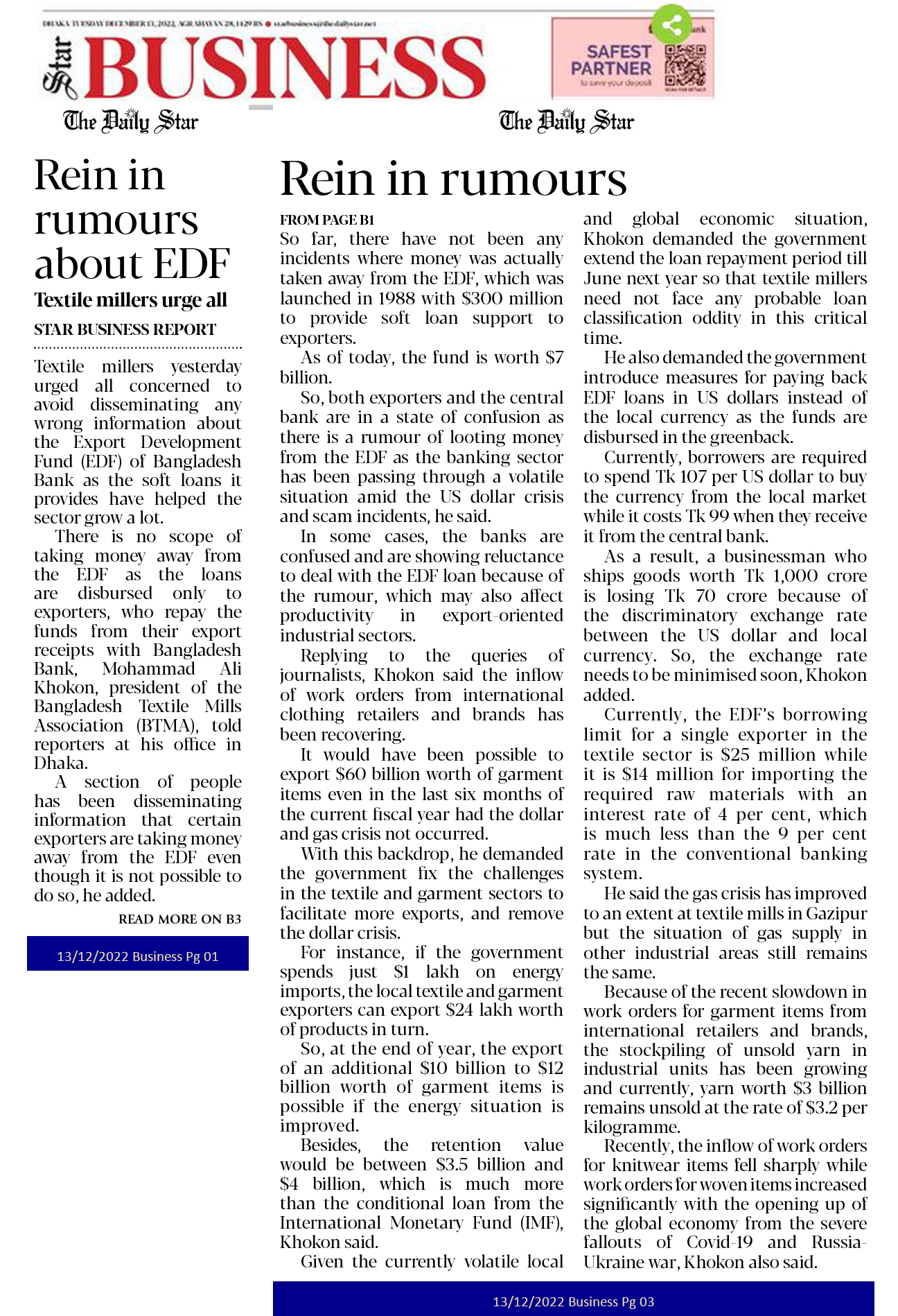 বিটিএমএ সভাপতি বলেন, রিজার্ভের টান পড়ার সঙ্গে ইডিএফ কোনো সম্পর্ক নেই। কোনো কোনো মহল থেকে এ ব্যাপারে বিভ্রান্তিকর এবং অসত্য বক্তব্য দেওয়া হচ্ছে। বিশ্ববাজারে বাংলাদেশের রপ্তানি খাতকে দুর্বল করার ষড়যন্ত্র হিসেবেই এ ধরনের বিভ্রান্তি ছড়ানো হচ্ছে। বিশ্বব্যাপী করোনার অভিঘাতের মধ্যেও অন্যান্য দেশের রপ্তানি যেখানে কমেছে, সেখানে বাংলাদেশ রেকর্ড ৫২ কোটি ডলারের রপ্তানি করেছে। গ্যাস-বিদ্যুতের সংকটের মধ্যেই শিল্প টিকে আছে। এ নিয়ে কারও কারও গাত্রদাহ থেকেই এসব অপপ্রচার চালানো হচ্ছে। ইডিএফ বন্ধ করে দেওয়া, আকার ছোট করা ও ঋণের সুদের হার বাড়ানোর কথা বলা হয়েছে অপপ্রচারের অংশ হিসেবে। এর মাধ্যমে বিশ্ববাজারে বাংলাদেশের পোশাক খাতকে পিছিয়ে দিতে চায় একটি মহল।