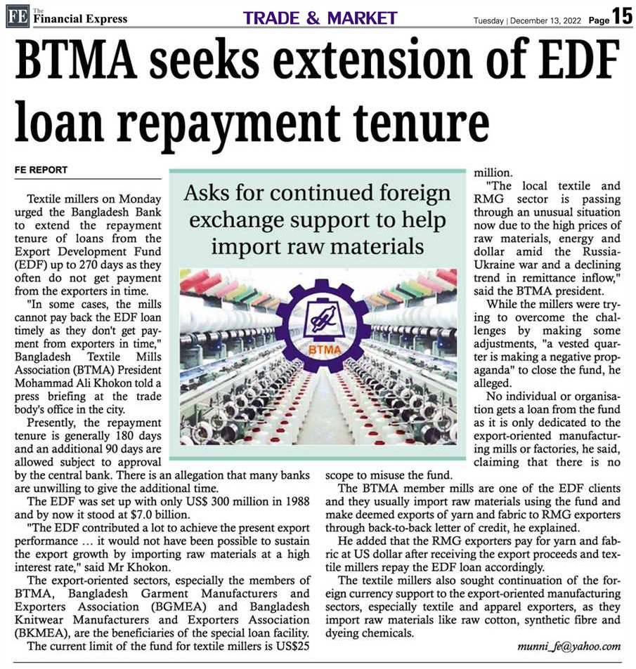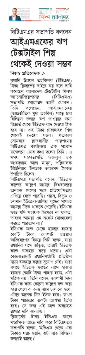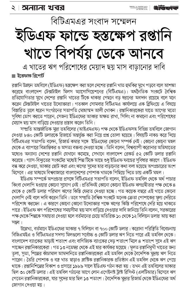 গতকাল সোমবার এক সংবাদ সম্মেলনে বাংলাদেশ টেক্সটাইল মিলস অ্যাসোসিয়েশনের (বিটিএমএ) পক্ষ থেকে এসব কথা বলা হয়েছে। সংবাদ সম্মেলনে এ বিষয়ে বিটিএমএর পর্যবেক্ষণ ও মতামত তুলে ধরেন সংগঠনের সভাপতি মোহাম্মদ আলী খোকন। ইডিএফের আকার অক্ষত রাখা, ঋণসীমা না কমানো ও পরিশোধের মেয়াদ ছয় মাস বাড়িয়ে দেওয়ার প্রস্তাব করেন তিনি। রাজাধানীর পান্থপথে বিটিএমএ কার্যালয়ে এ সংবাদ সম্মেলনের আয়োজন করা হয়।………………