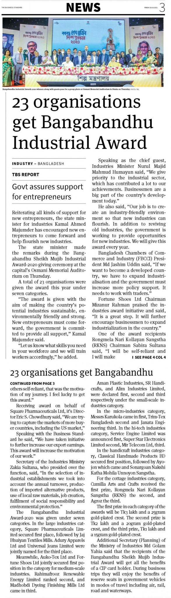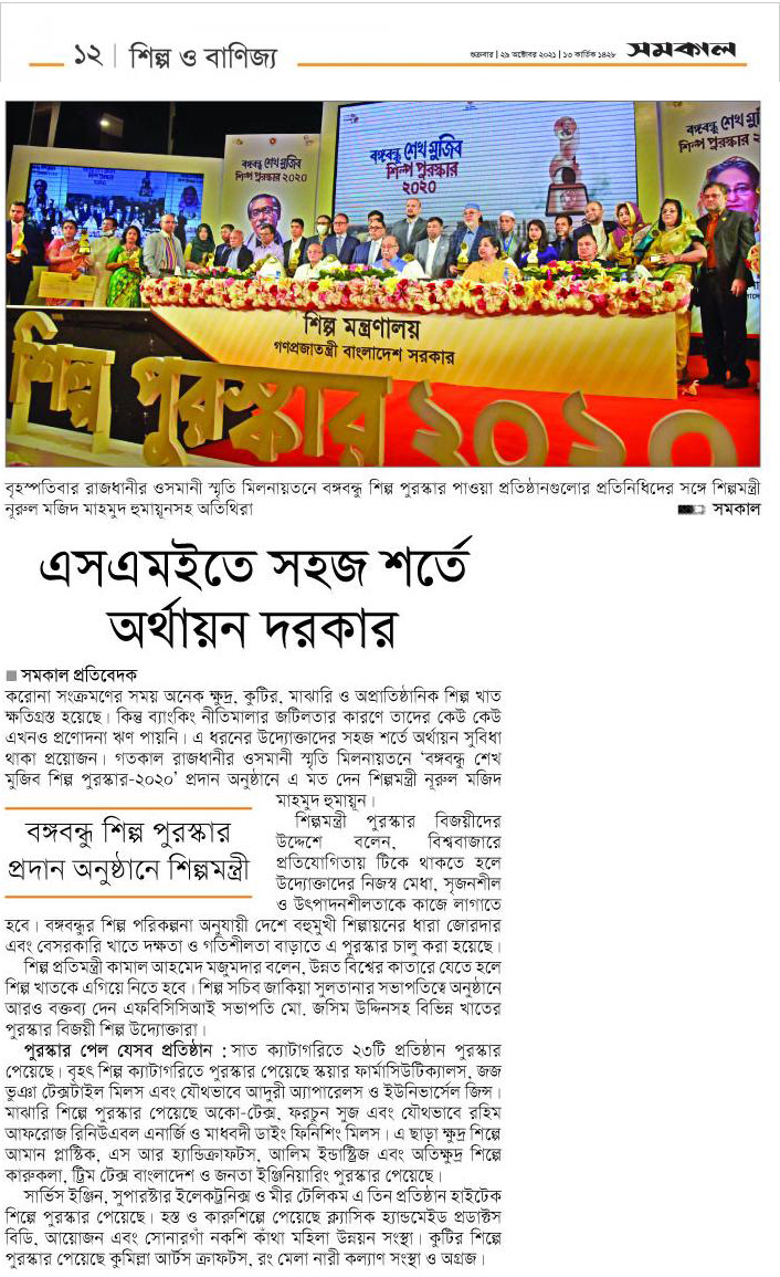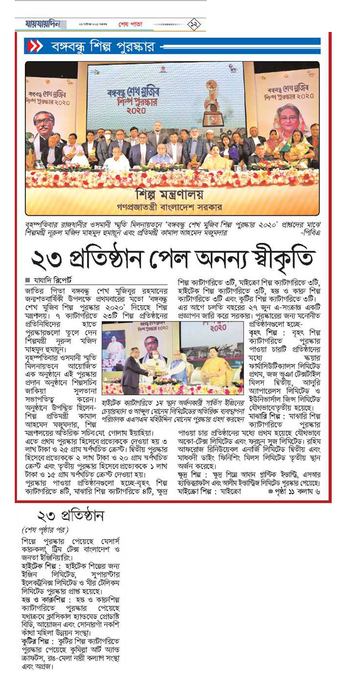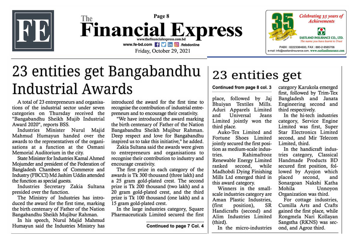 In the large industries category, Square Pharmaceuticals Limited secured first place, followed by Jaj Bhuiyan Textiles Mills. Adury Apparels Ltd and Universal Jeans Limited were jointly named for the third place…..Read the Full News on The Daily Business Standard. Related news published on The Financial Express, The Daily Shamakal & Jaijaidin etc.