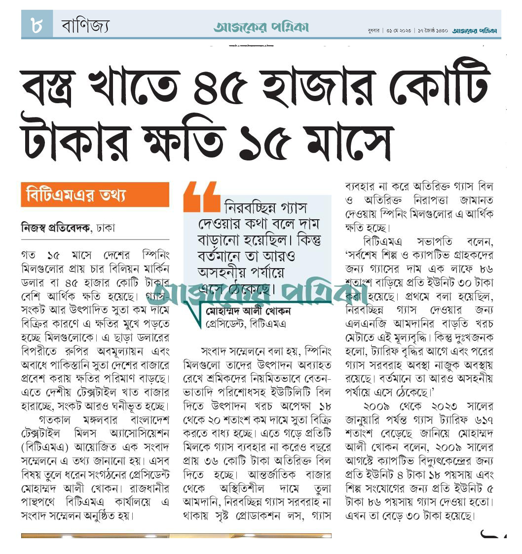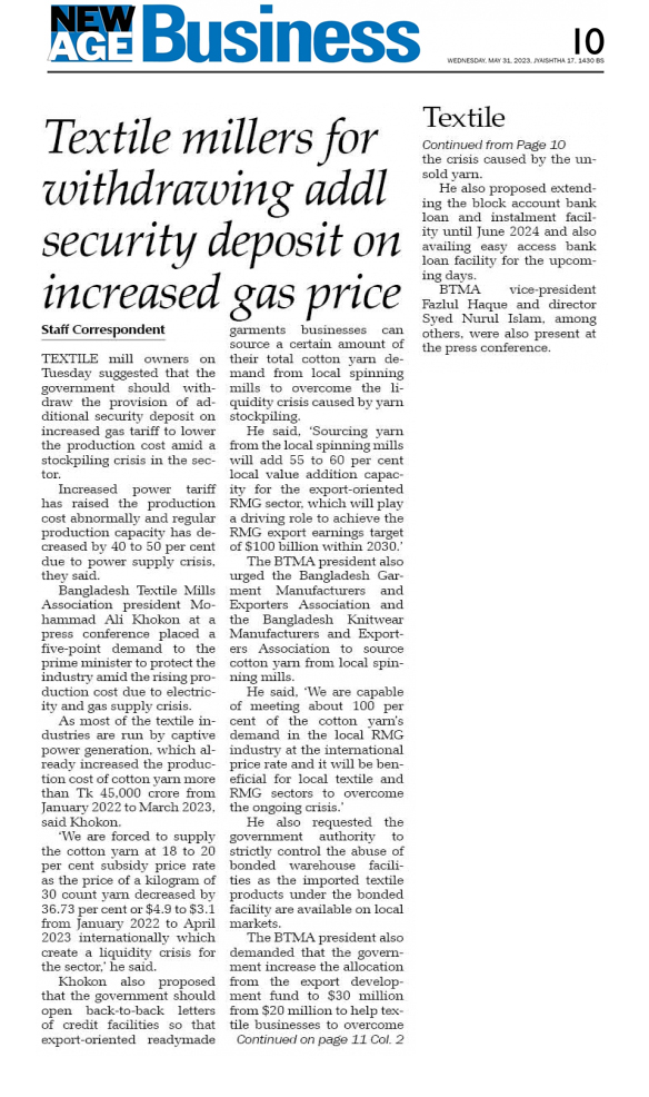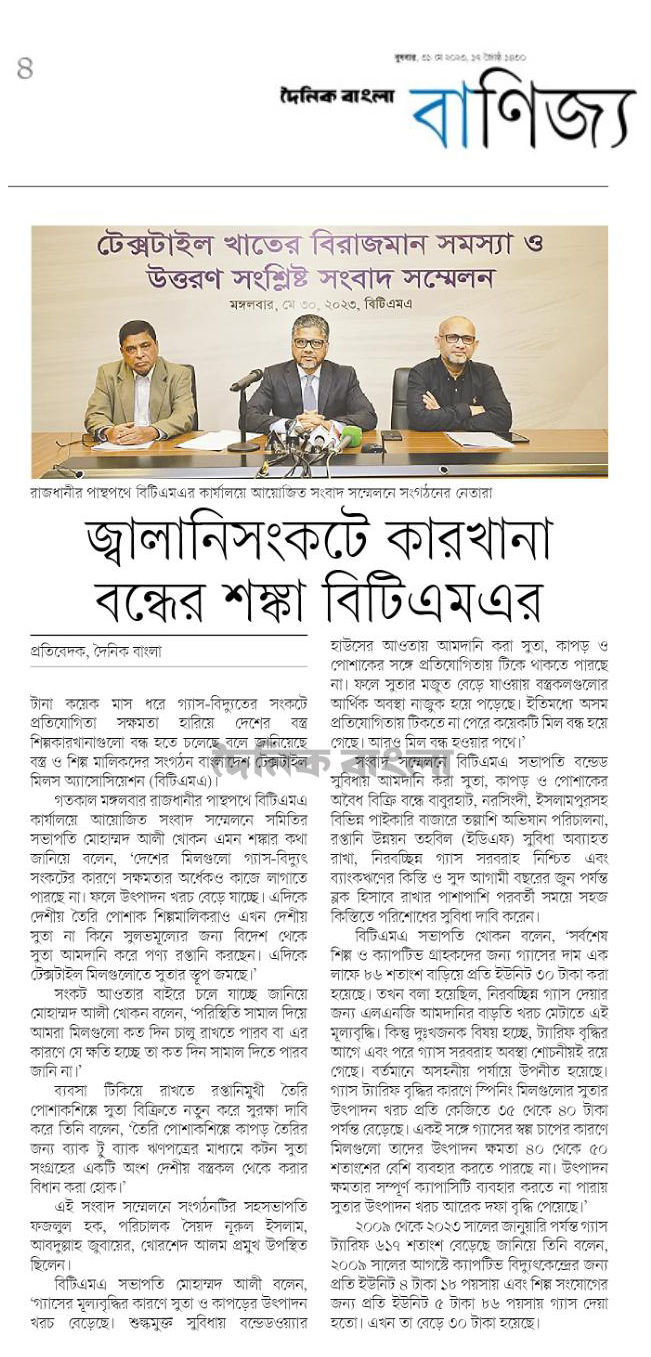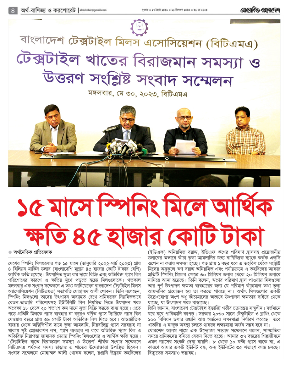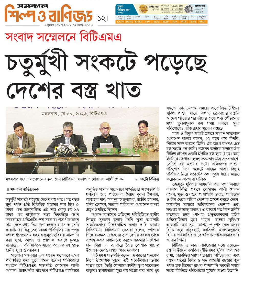 A Press Conference was held on 30th May, 2023 at BTMA Office. To brief the media personalities about the prevailing situation in the Primary Textile Sectors due to severe gas crisis, unauthorized marketing of yarn, fabrics and dress materials imported through bond. Reporters of Print & Electronic media’s covered the press conference. Mr. Mohammad Ali Khokon, President, BTMA briefs the media. A good no. of members of the B.O.Directors of BTMA attended the press conference namely Mr. Md. Fazlul Hoque, Vice-President, BTMA and respectively Mr. Md. Mosharaf Hossain, Mr. Md. Monir Hossain, Mr. Md. Saleudh Zaman Khan, Mr. M. Solaiman, Syed Enayet Kabir, Engr. Razeeb Haider, Mrs. Monalisa Mannan, Md. Abdullah Zubair, Mr.M.Hafizur Rahman Khan, Mr.Syed Nurul Islam, Md. Fayazur Rahman Bhuiyan, Md. Kamrul Hassan, Md. Azahar Khan, Directors, BTMA. Therefore other BTMA Members Mr. Khurshed Alam, Mr. Ruhul Amin and Mr. Salman A Rahman were also attended the meeting.