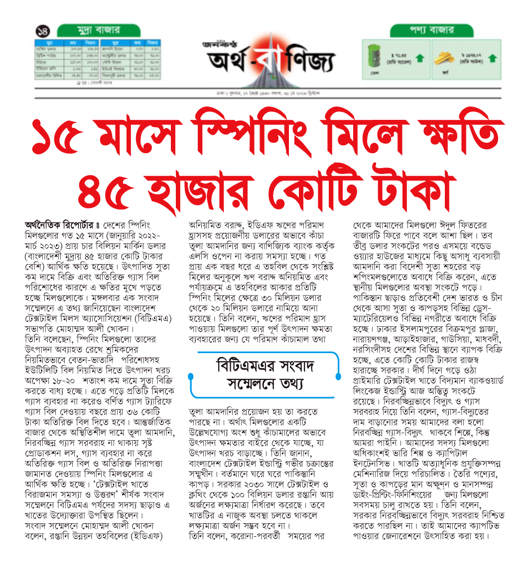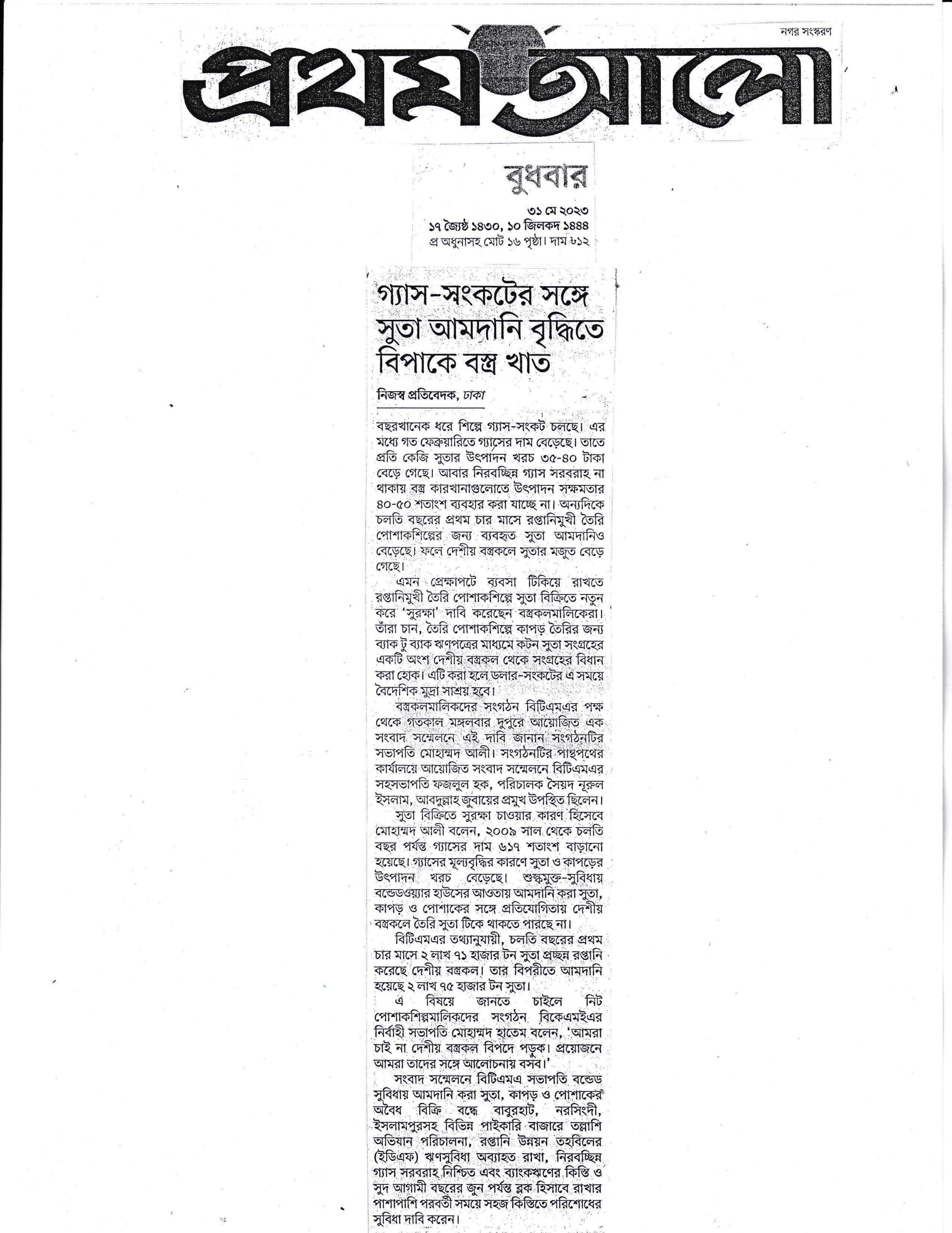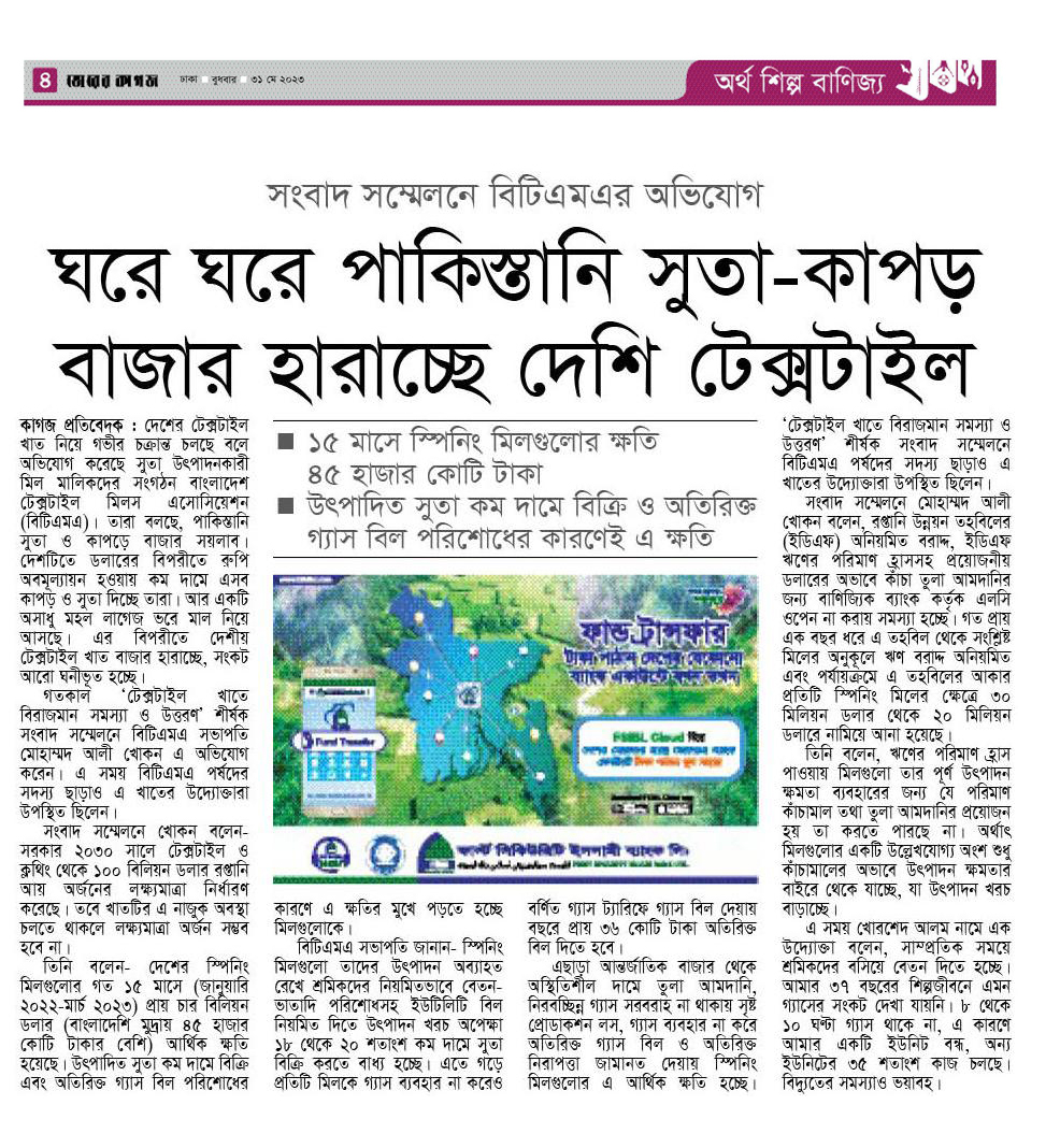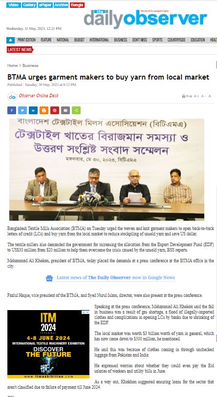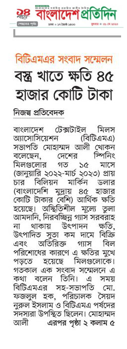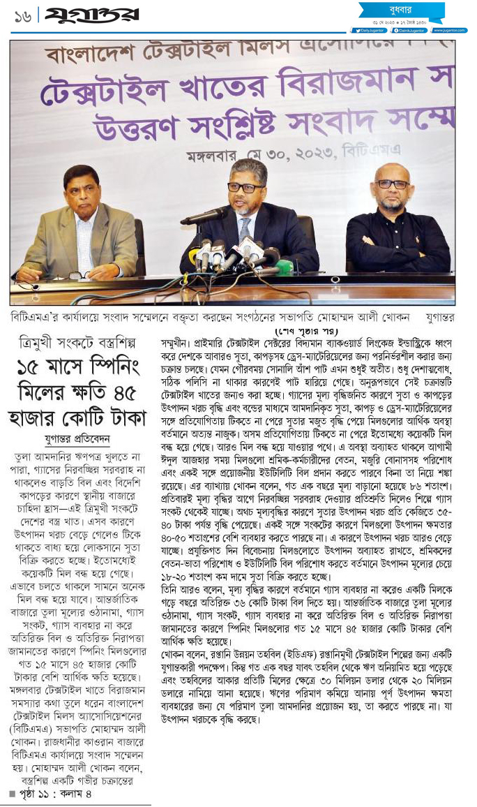 A Press Conference was held on 30th May, 2023 at BTMA Office. To brief the media personalities about the prevailing situation in the Primary Textile Sectors due to severe gas crisis, unauthorized marketing of yarn, fabrics and dress materials imported through bond. Reporters of Print & Electronic media’s covered the press conference. Mr. Mohammad Ali Khokon, President, BTMA briefs the media. A good no. of members of the B.O.Directors of BTMA attended the press conference namely Mr. Md. Fazlul Hoque, Vice-President, BTMA and respectively Mr. Md. Mosharaf Hossain, Mr. Md. Monir Hossain, Mr. Md. Saleudh Zaman Khan, Mr. M. Solaiman, Syed Enayet Kabir, Engr. Razeeb Haider, Mrs. Monalisa Mannan, Md. Abdullah Zubair, Mr.M.Hafizur Rahman Khan, Mr.Syed Nurul Islam, Md. Fayazur Rahman Bhuiyan, Md. Kamrul Hassan, Md. Azahar Khan, Directors, BTMA. Therefore other BTMA Members Mr. Khurshed Alam, Mr. Ruhul Amin and Mr. Salman A Rahman were also attended the meeting.