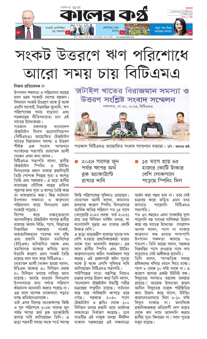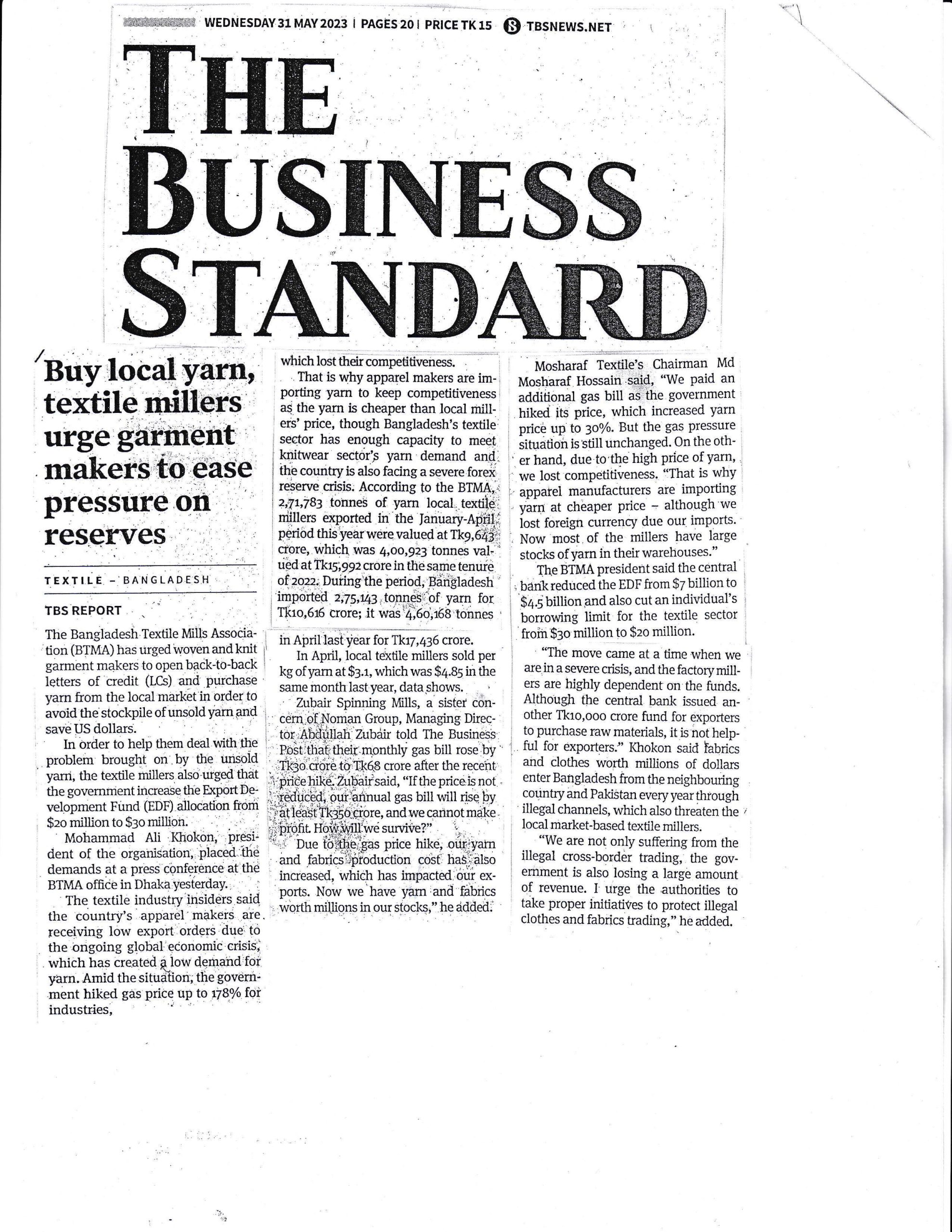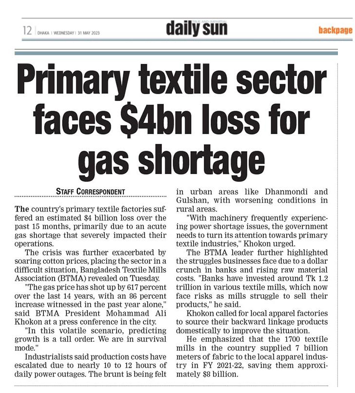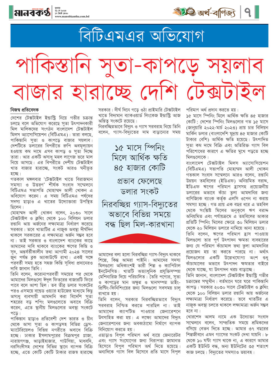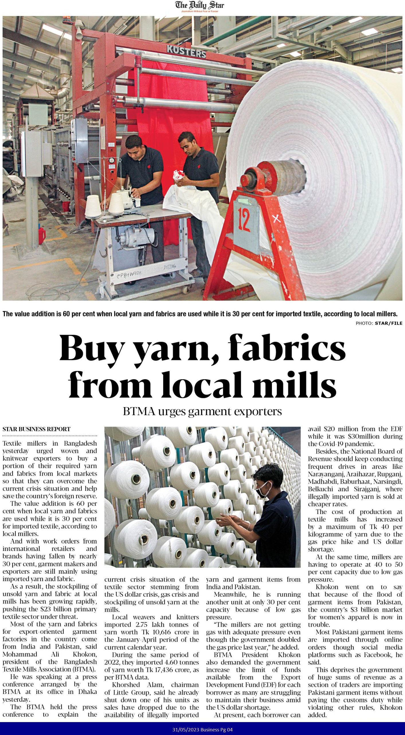 A Press Conference was held on 30th May, 2023 at BTMA Office. To brief the media personalities about the prevailing situation in the Primary Textile Sectors due to severe gas crisis, unauthorized marketing of yarn, fabrics and dress materials imported through bond. Reporters of Print & Electronic media’s covered the press conference. Mr. Mohammad Ali Khokon, President, BTMA briefs the media. A good no. of members of the B.O.Directors of BTMA attended the press conference namely Mr. Md. Fazlul Hoque, Vice-President, BTMA and respectively Mr. Md. Mosharaf Hossain, Mr. Md. Monir Hossain, Mr. Md. Saleudh Zaman Khan, Mr. M. Solaiman, Syed Enayet Kabir, Engr. Razeeb Haider, Mrs. Monalisa Mannan, Md. Abdullah Zubair, Mr.M.Hafizur Rahman Khan, Mr.Syed Nurul Islam, Md. Fayazur Rahman Bhuiyan, Md. Kamrul Hassan, Md. Azahar Khan, Directors, BTMA. Therefore other BTMA Members Mr. Khurshed Alam, Mr. Ruhul Amin and Mr. Salman A Rahman were also attended the meeting.
