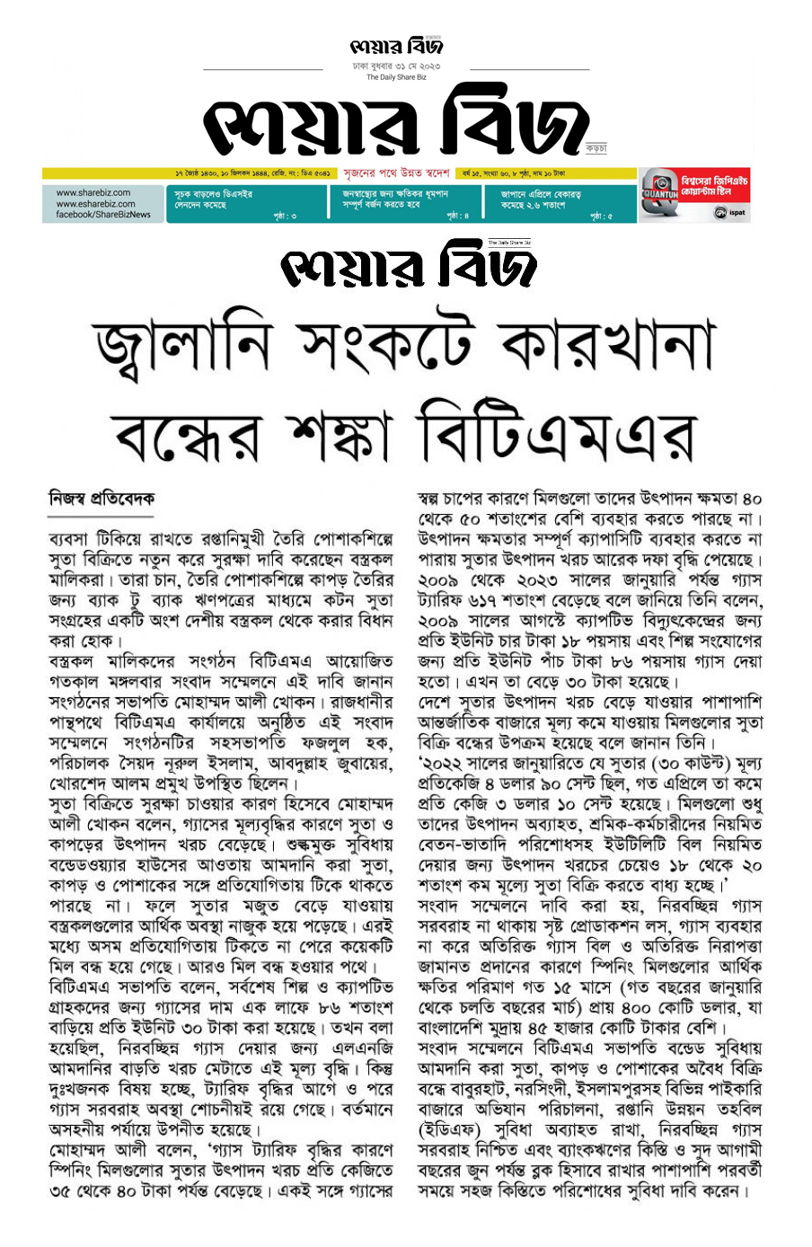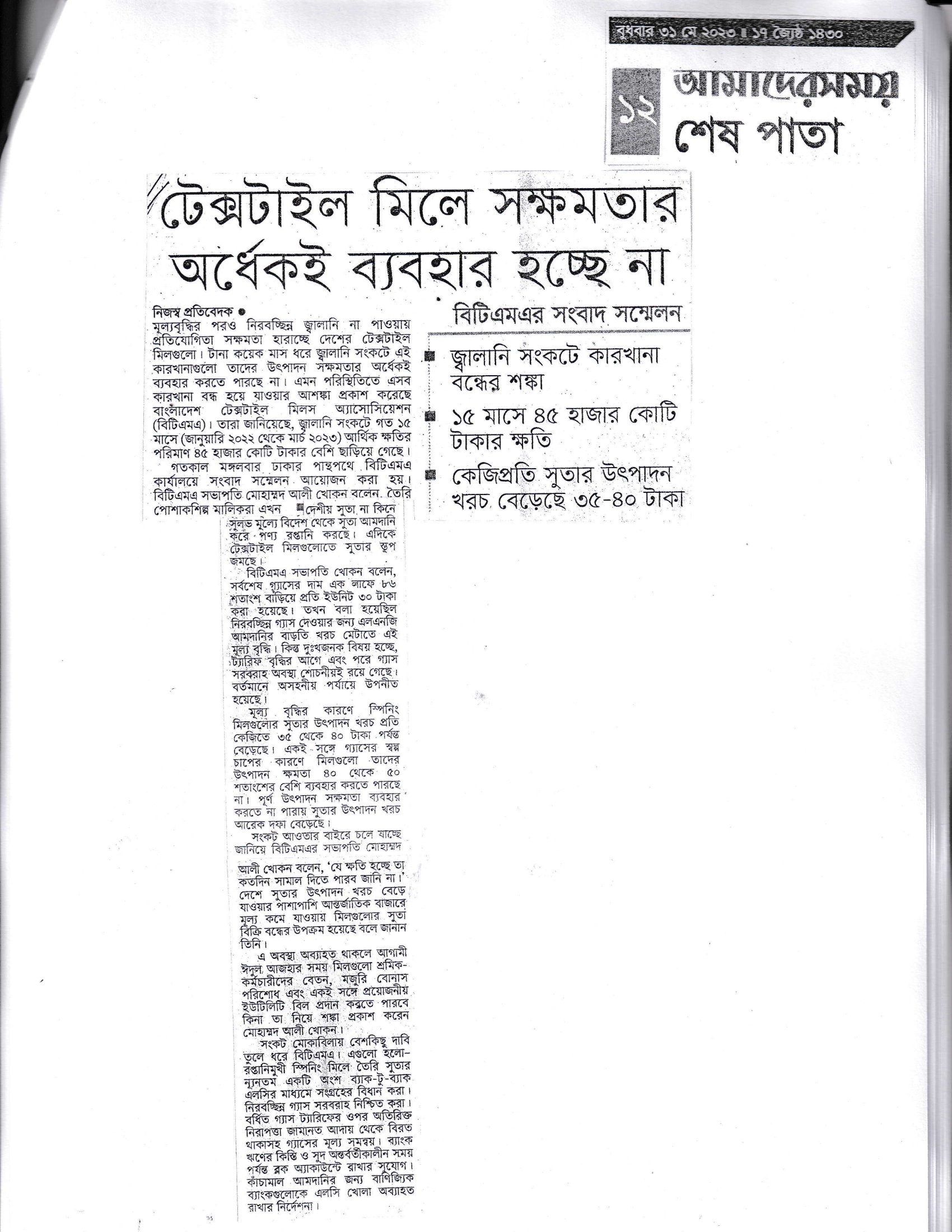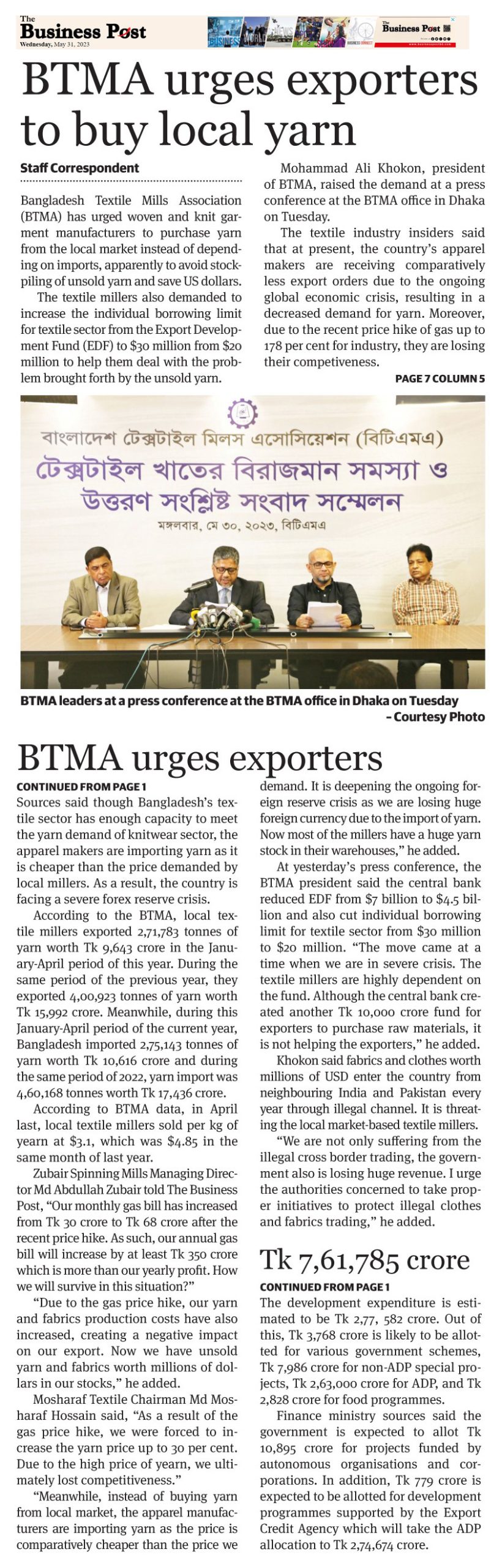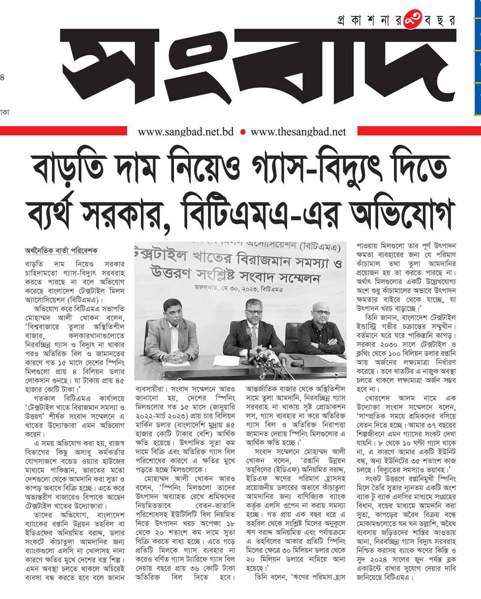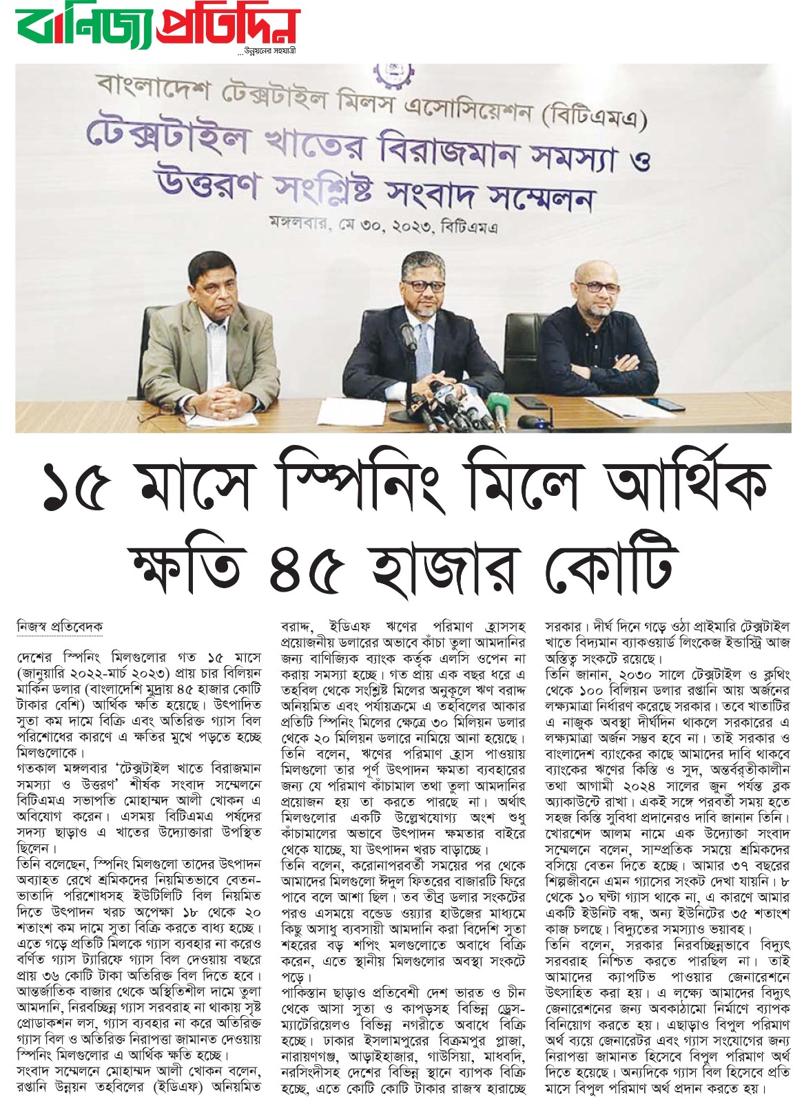 A Press Conference was held on 30th May, 2023 at BTMA Office. To brief the media personalities about the prevailing situation in the Primary Textile Sectors due to severe gas crisis, unauthorized marketing of yarn, fabrics and dress materials imported through bond. Reporters of Print & Electronic media’s covered the press conference. Mr. Mohammad Ali Khokon, President, BTMA briefs the media. A good no. of members of the B.O.Directors of BTMA attended the press conference namely Mr. Md. Fazlul Hoque, Vice-President, BTMA and respectively Mr. Md. Mosharaf Hossain, Mr. Md. Monir Hossain, Mr. Md. Saleudh Zaman Khan, Mr. M. Solaiman, Syed Enayet Kabir, Engr. Razeeb Haider, Mrs. Monalisa Mannan, Md. Abdullah Zubair, Mr.M.Hafizur Rahman Khan, Mr.Syed Nurul Islam, Md. Fayazur Rahman Bhuiyan, Md. Kamrul Hassan, Md. Azahar Khan, Directors, BTMA. Therefore other BTMA Members Mr. Khurshed Alam, Mr. Ruhul Amin and Mr. Salman A Rahman were also attended the meeting.
