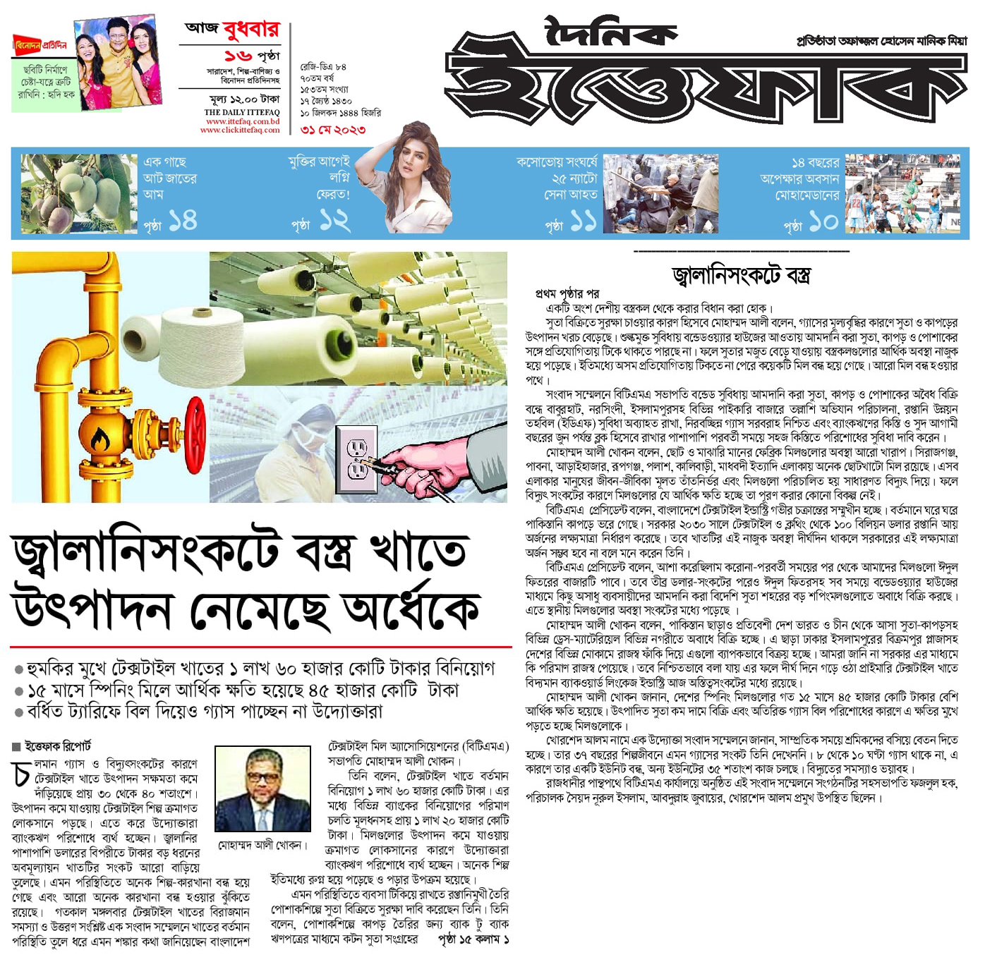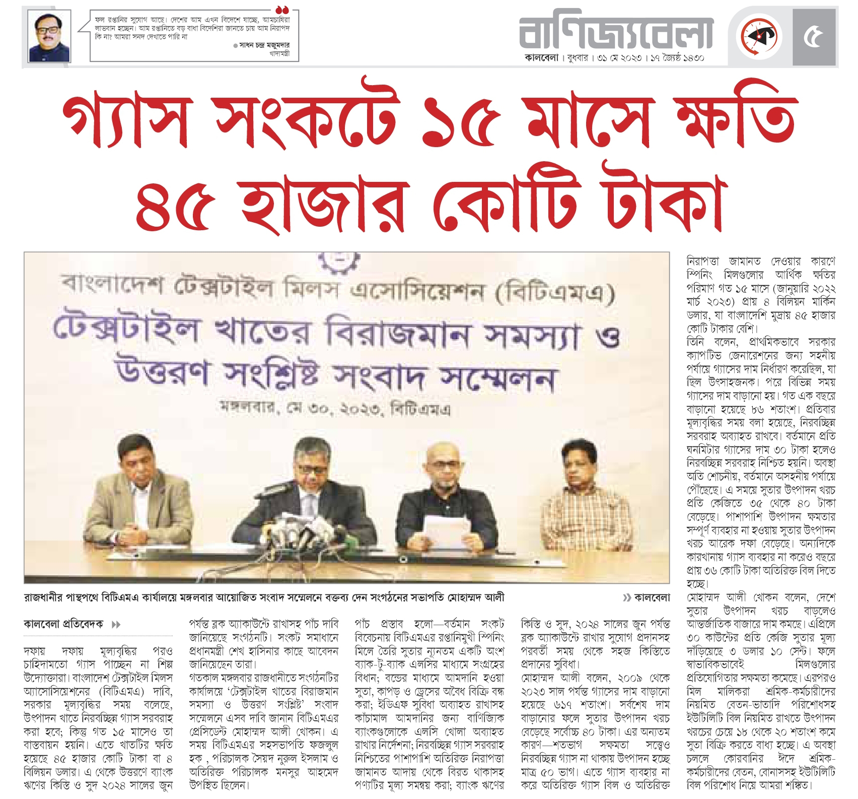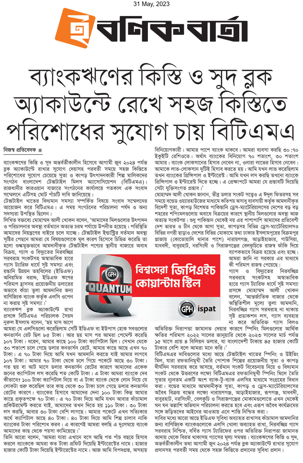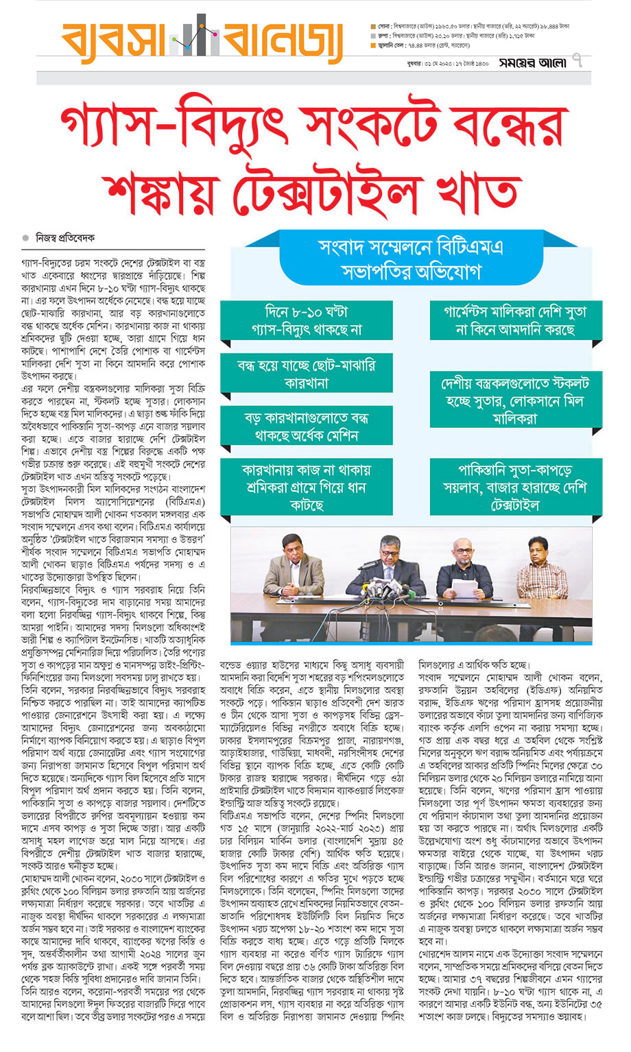 A Press Conference was held on 30th May, 2023 at BTMA Office. To brief the media personalities about the prevailing situation in the Primary Textile Sectors due to severe gas crisis, unauthorized marketing of yarn, fabrics and dress materials imported through bond. Reporters of Print & Electronic media’s covered the press conference. Mr. Mohammad Ali Khokon, President, BTMA briefs the media. A good no. of members of the B.O.Directors of BTMA attended the press conference namely Mr. Md. Fazlul Hoque, Vice-President, BTMA and respectively Mr. Md. Mosharaf Hossain, Mr. Md. Monir Hossain, Mr. Md. Saleudh Zaman Khan, Mr. M. Solaiman, Syed Enayet Kabir, Engr. Razeeb Haider, Mrs. Monalisa Mannan, Md. Abdullah Zubair, Mr.M.Hafizur Rahman Khan, Mr.Syed Nurul Islam, Md. Fayazur Rahman Bhuiyan, Md. Kamrul Hassan, Md. Azahar Khan, Directors, BTMA. Therefore other BTMA Members Mr. Khurshed Alam, Mr. Ruhul Amin and Mr. Salman A Rahman were also attended the meeting.