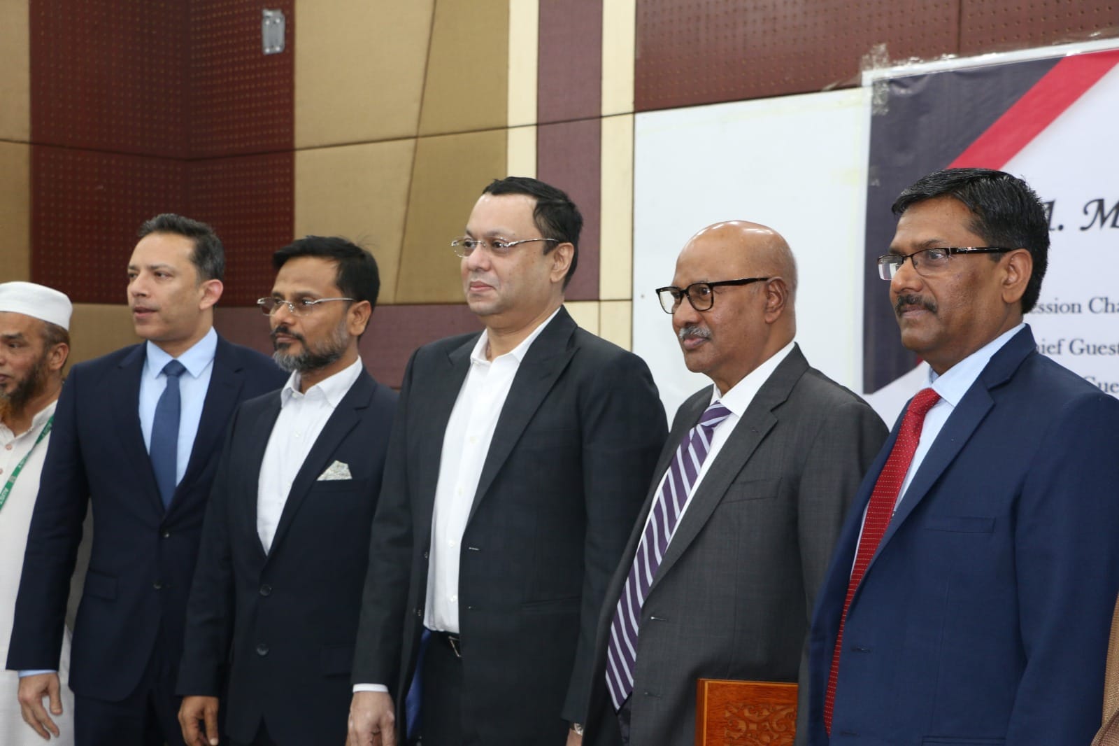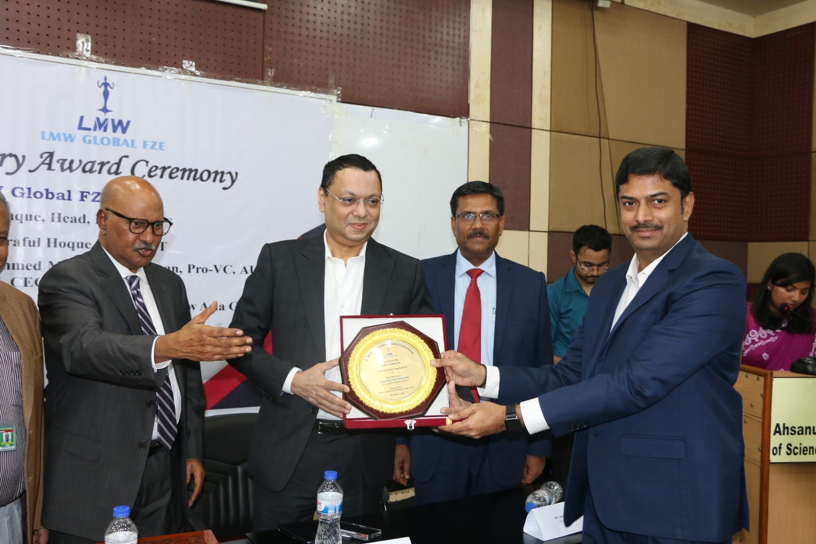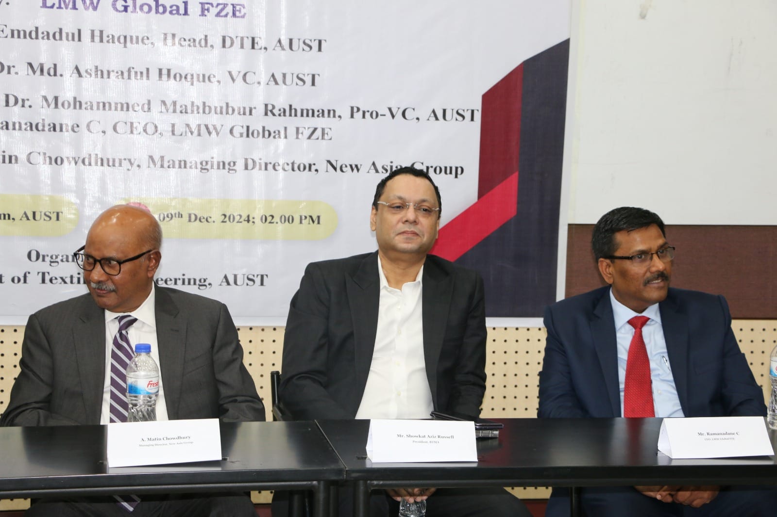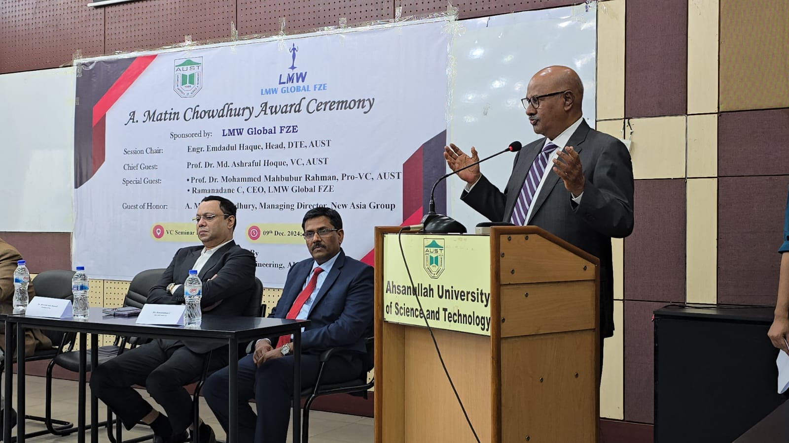 ০৯.১২.২০২৪ইং; তেজগাও, ঢাকা: আহসানউল্লাহ ইউনির্ভাসিটি অব সাইন্স এন্ড টেকনোলজি এর টেক্সটাইল ইঞ্জিনিয়ারিং বিভাগের আয়োজনে ভিসি কনফারেন্স রুমে LMW Global FZE এর স্পন্সরশীপে এ. মতিন চৌধুরী অ্যাওয়ার্ড সিরিমনি অনুষ্ঠিত হয়। অনুষ্ঠানে সভাপতিত্ব করেন ইঞ্জিনিয়ার ইমদাদুল হক (বিভাগীয় প্রধান টেক্সটাইল ইঞ্জিনিয়ারিং) আহসানউল্লাহ ইউনির্ভাসিটি অব সাইন্স এন্ড টেকনোলজি। প্রধান অতিথি হিসেবে উপস্থিত ছিলেন প্রফেসর ড. মোঃ আশরাফুল হক (উপাচার্য) আহসানউল্লাহ ইউনির্ভাসিটি অব সাইন্স এন্ড টেকনোলজি। বিশেষ অতিথি হিসেবে উপস্থিত ছিলেন বিটিএমএ’র প্রেসিডেন্ট জনাব শওকত আজিজ রাসেল। সম্মানিত অতিথি হিসেবে উপস্থিত ছিলেন এ. মতিন চৌধুরী ব্যবস্থাপনা পরিচালক, নিউ এশিয়া গ্রূপ। বিটিএমএ’র সম্মানিত প্রেসিডেন্ট জনাব শওকত আজিজ রাসেল উক্ত অনুষ্ঠানে বক্তব্য প্রদান করেন। বক্তব্যে তিনি বিশেষ করে বাংলাদেশে প্লাস্টিক ফাইবার উৎপাদনের উপর গুরুত্ব আরোপ করেন। এ সময় অনুষ্ঠানে আরো উপস্থিত ছিলেন বিটিএমএ’র পরিচালক জনাব মোঃ মাসুদ রানা। অনুষ্ঠান শেষে টেক্সটাইল সেক্টরে সুতা ও সুতা দ্বারা উৎপাদন নির্ভর পন্যের উপর গবেষনার স্বীকৃতি স্বরূপ ক্রেষ্ট, সনদ এবং প্রাইজমানী প্রদান করা হয়।